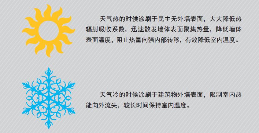 建築用反射隔熱塗孝鬥可廣泛應用於(yú)建築物混凝土表面、金屬表面、異型設備(bèi)等的隔熱保溫。 ◆防火不然、防塵自潔、無毒環保 水性塗料防火不燃、防塵自潔、超低 VOC無毒環保。