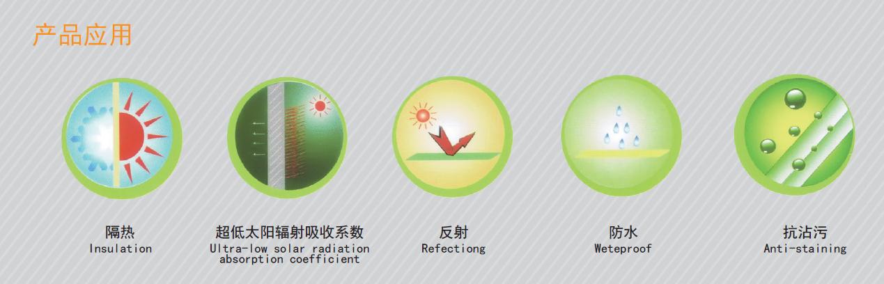 使用前應先閱讀使用說明書,以獲得可靠和滿意的塗裝效果 。必須存放於(yú)陰涼幹爽的地方,嚴防霜凍(不低於(yú)零攝氏度 ),保質期爲12個月。本品爲水性塗料,不得與各類溶劑型材料同時施工。施工時應配戴面罩。如沾上眼睛 ,應及時用清水沖洗。施工後應立即用自來水沖洗工具。用後罐蓋應蓋緊密封保存,以防塗料沾 染灰塵和污垢。 産(chǎn)品應用 建築用反射隔熱塗料是指以合成樹脂爲基料,與功能性顔填料及助劑等配料而成,施塗於(yú)建築物表面,具有較高太陽光反射比(反射的和入射的太陽輻射能通量之比值)和較高半球發射率(實際物體發射到半 期空進的輻射通理與入射在物體表面上的輻射通量之比)塗料。